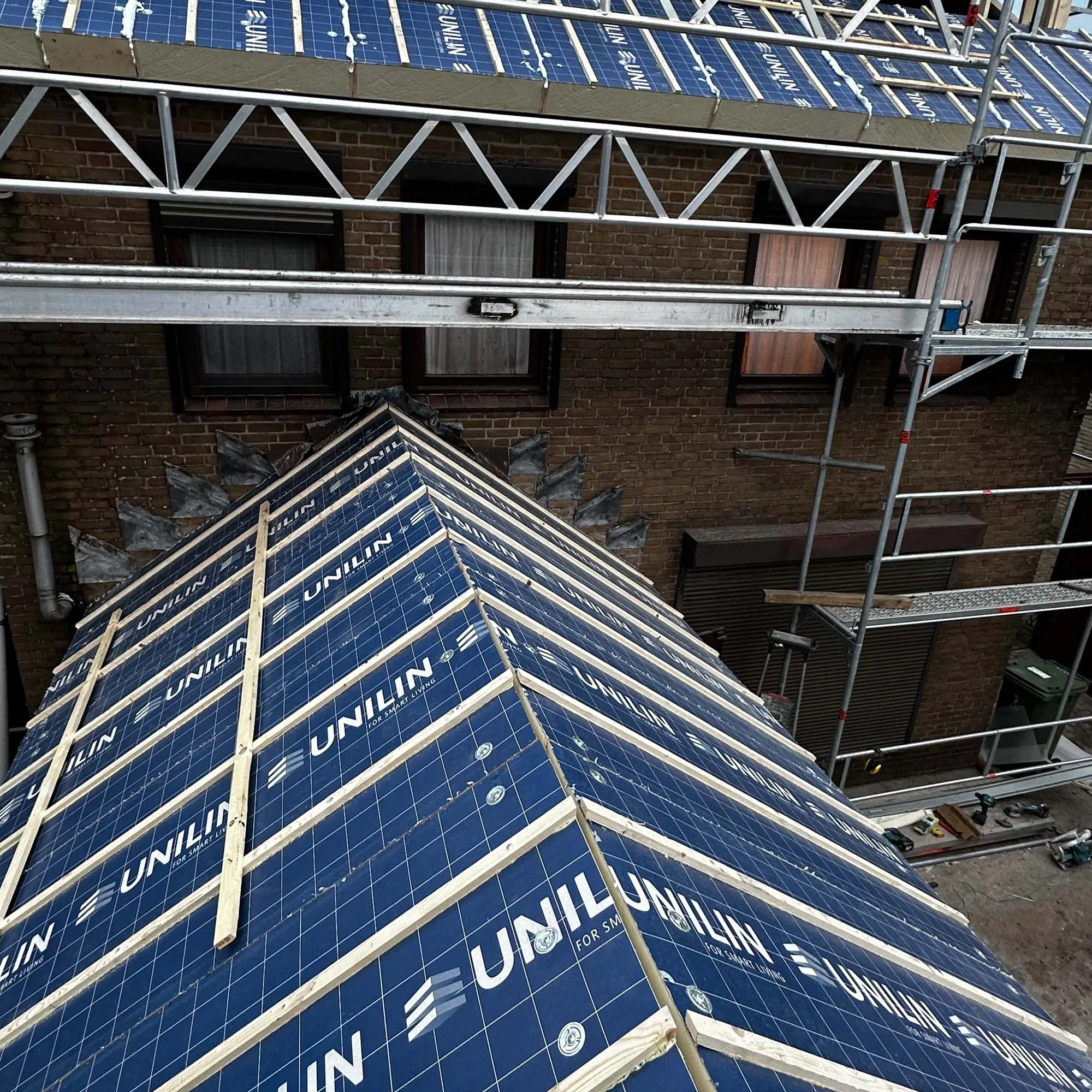 Om van de zolder een volwaardige ruimte te maken, is de complete kap van de zolder vernieuwd en uitgebouwd. Dit is uitgevoerd in de stijl van woning met mooie details als de aluminium afwerking van de goot en boeidelen (dakrandafwerking). Hiervoor hebben we een partner ingeschakeld: Thermo Kunstrukties uit Cuijk. Zij hebben ook de aluminium kozijnen geleverd en gemonteerd.