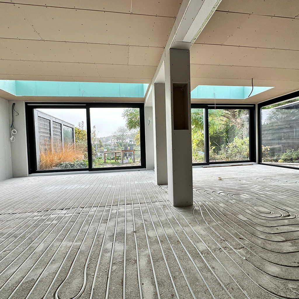 De binnenwanden op de begane grond zijn alle gestukt. Daarnaast is de volledige vloer op de begane grond voorzien van vloerverwarming, waarop een luxe tegelvloer is aangebracht van 1,2m x 1,2m tegels. Al met al een oogstrelende en succesvolle verbouwing.