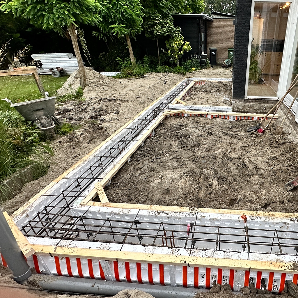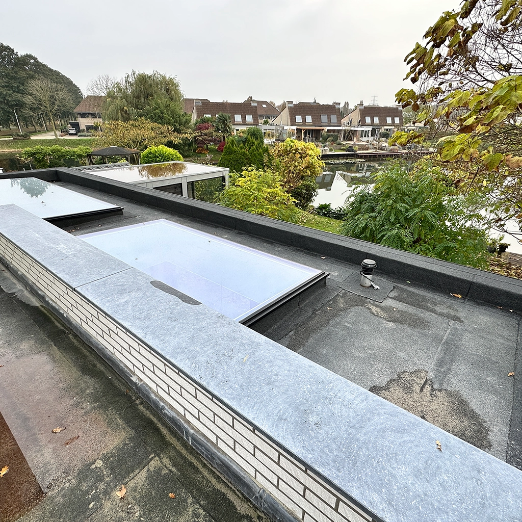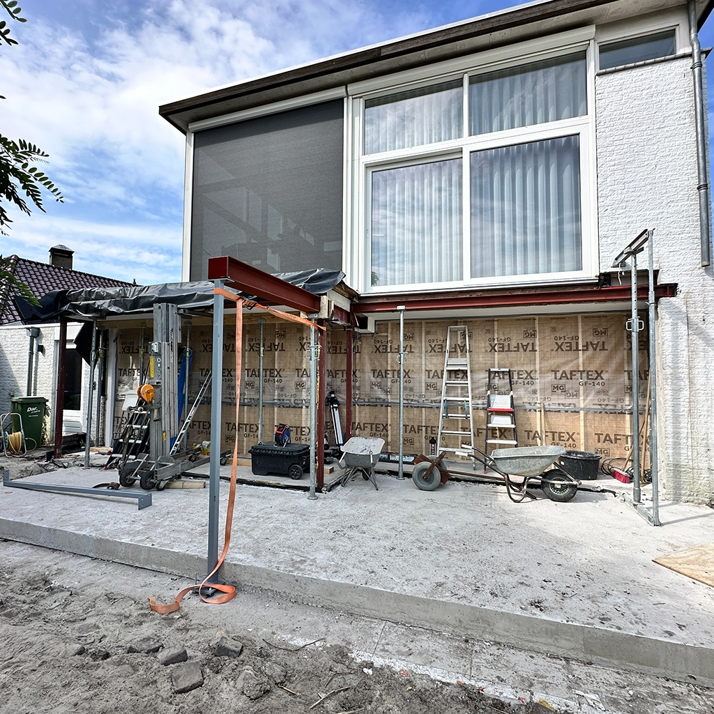 Wat de uitbouw zeer bijzonder maakt is de combinatie van het kleurcontrast en de stijlconsistentie. De bestaande woning is opgetrokken uit wit metselwerk. De uitbouw is geheel in stijl gemetseld, maar dan in de contrasterende kleur zwart. Naast het traditionele metselwerk zijn steenstrips gebruikt om de grote overstek te realiseren.