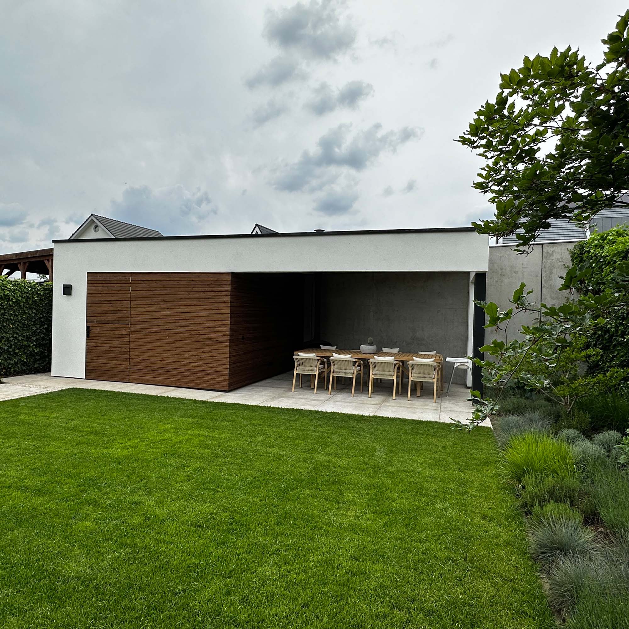 Achterin de ruime tuin van een huis aan de Vossenpelsestraat in Lent stond een klein schuurtje, met daarnaast een terras met eettafel. Dat kon beter! In dezelfde stijl als de bestaande woning hebben we een luxe tuinkamer gerealiseerd.