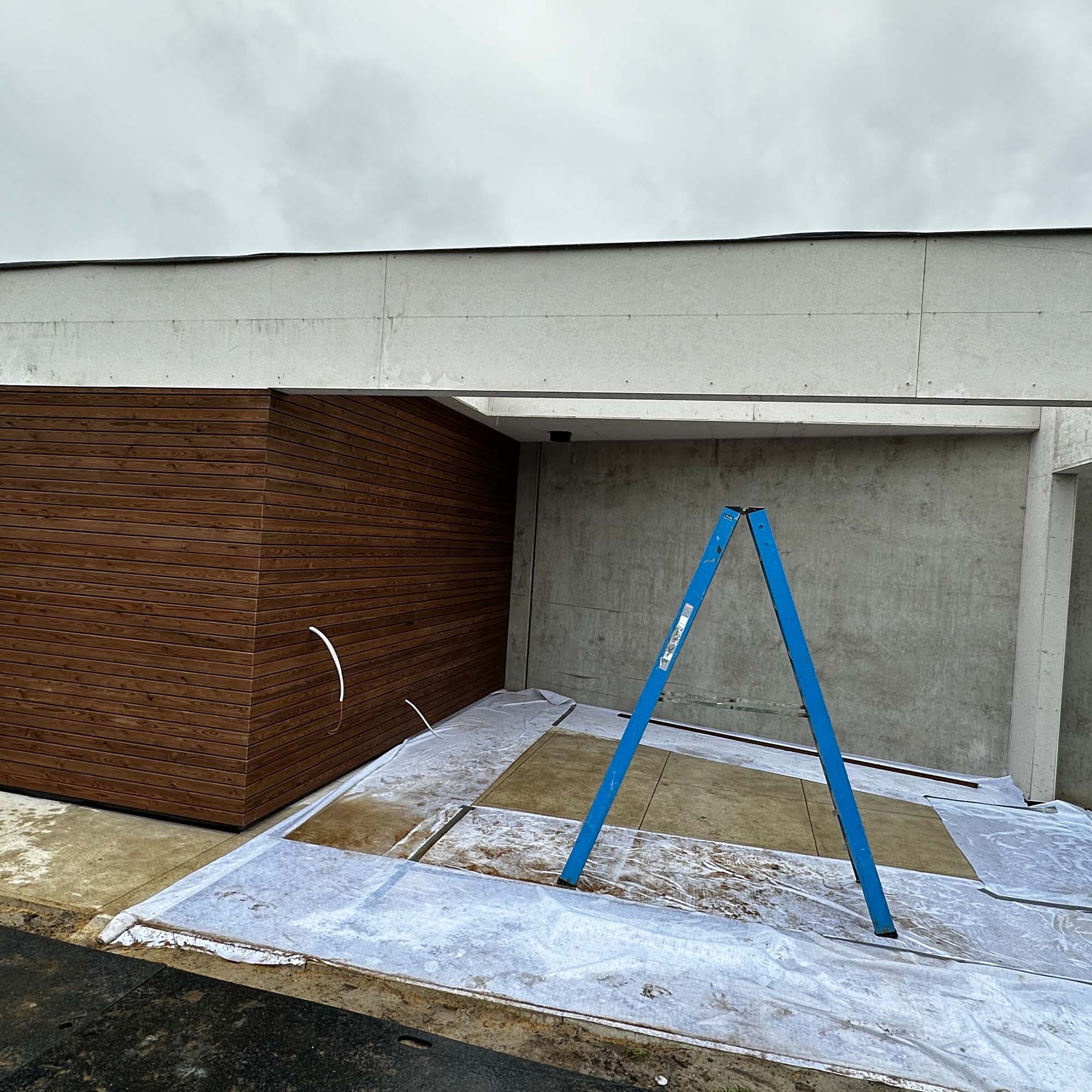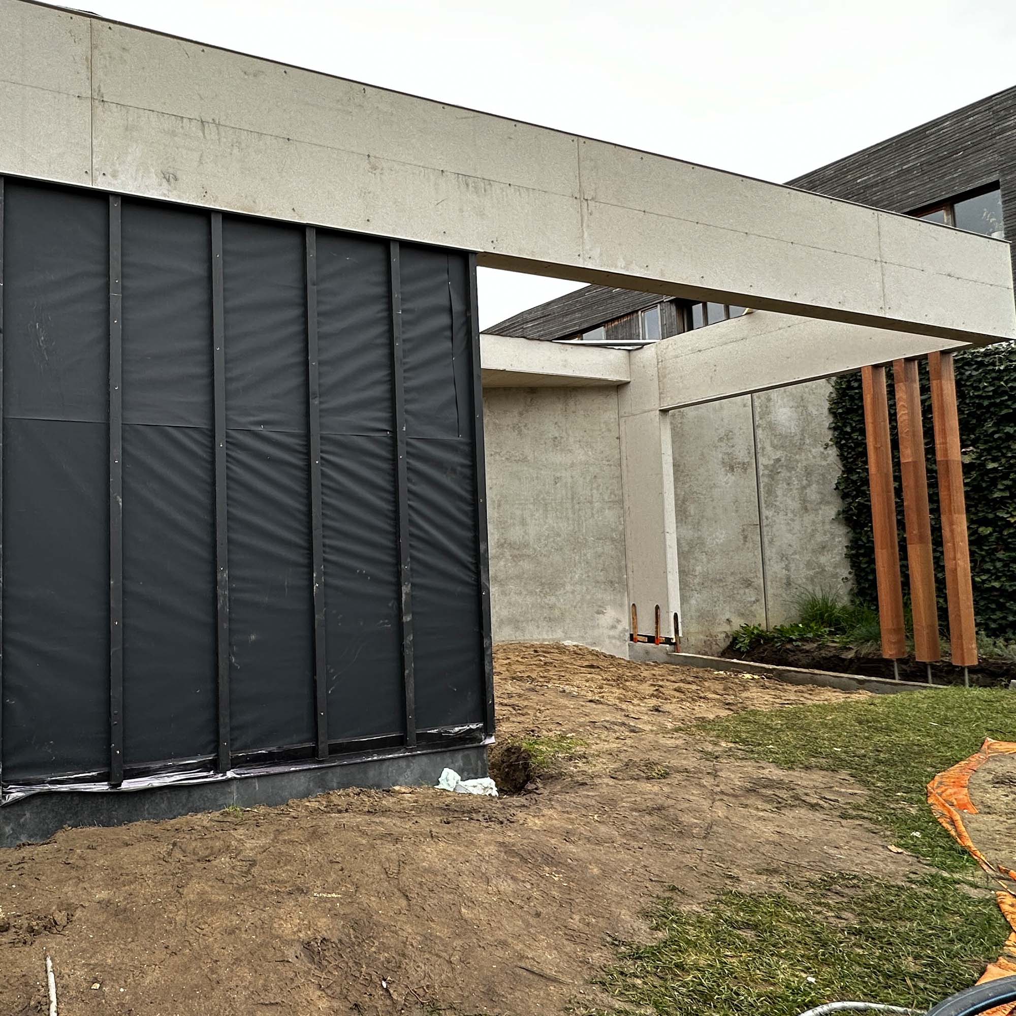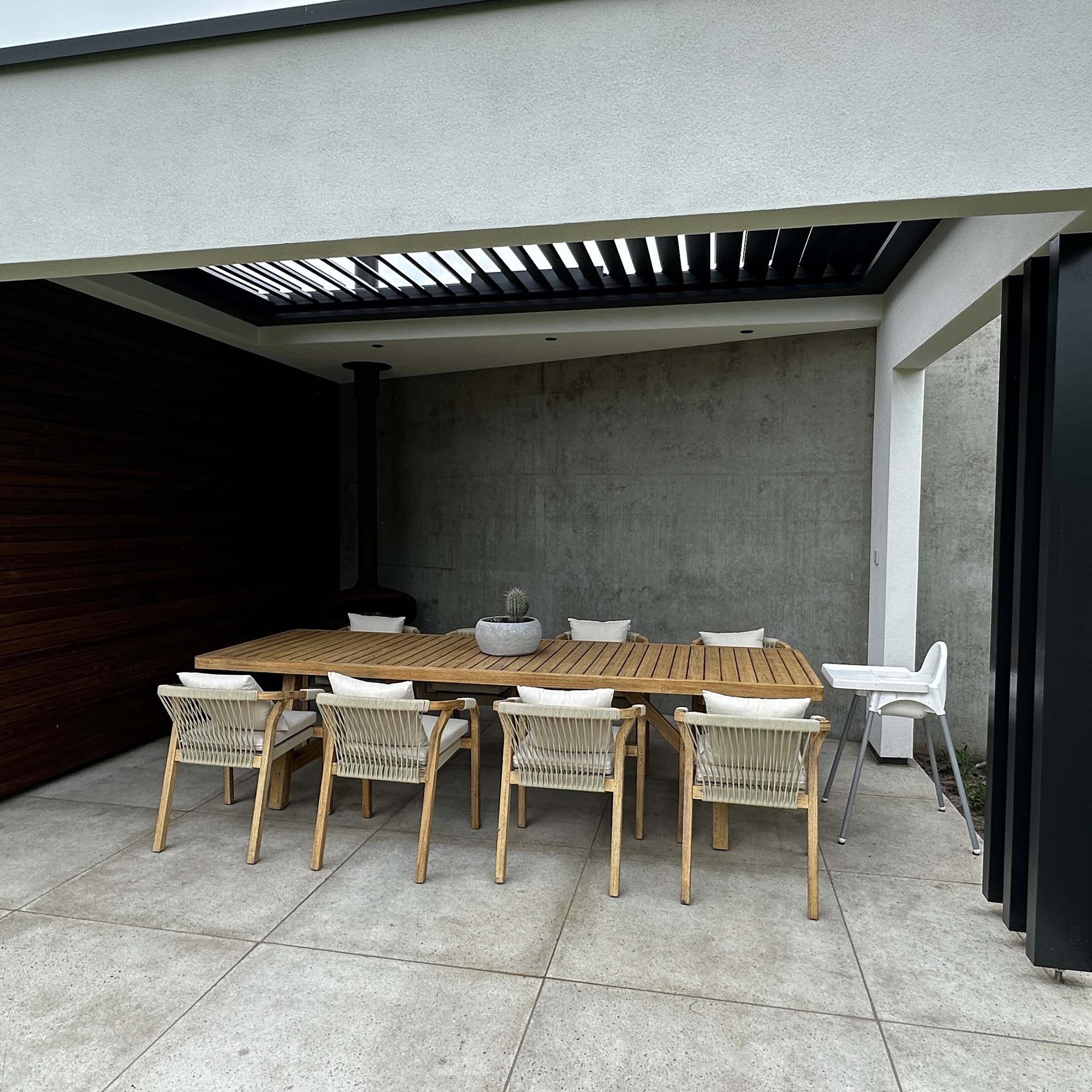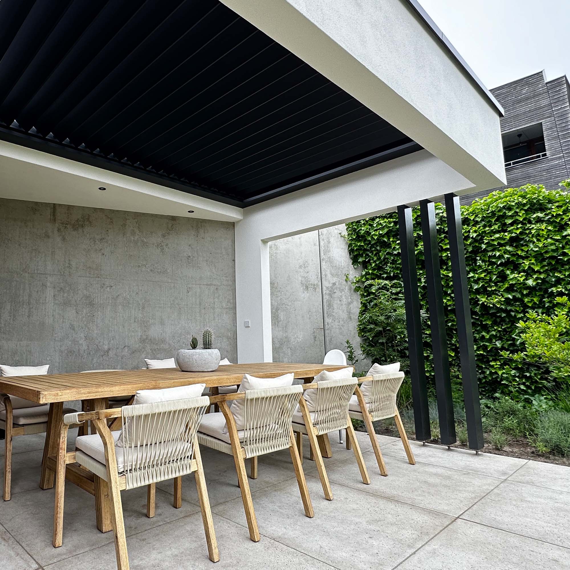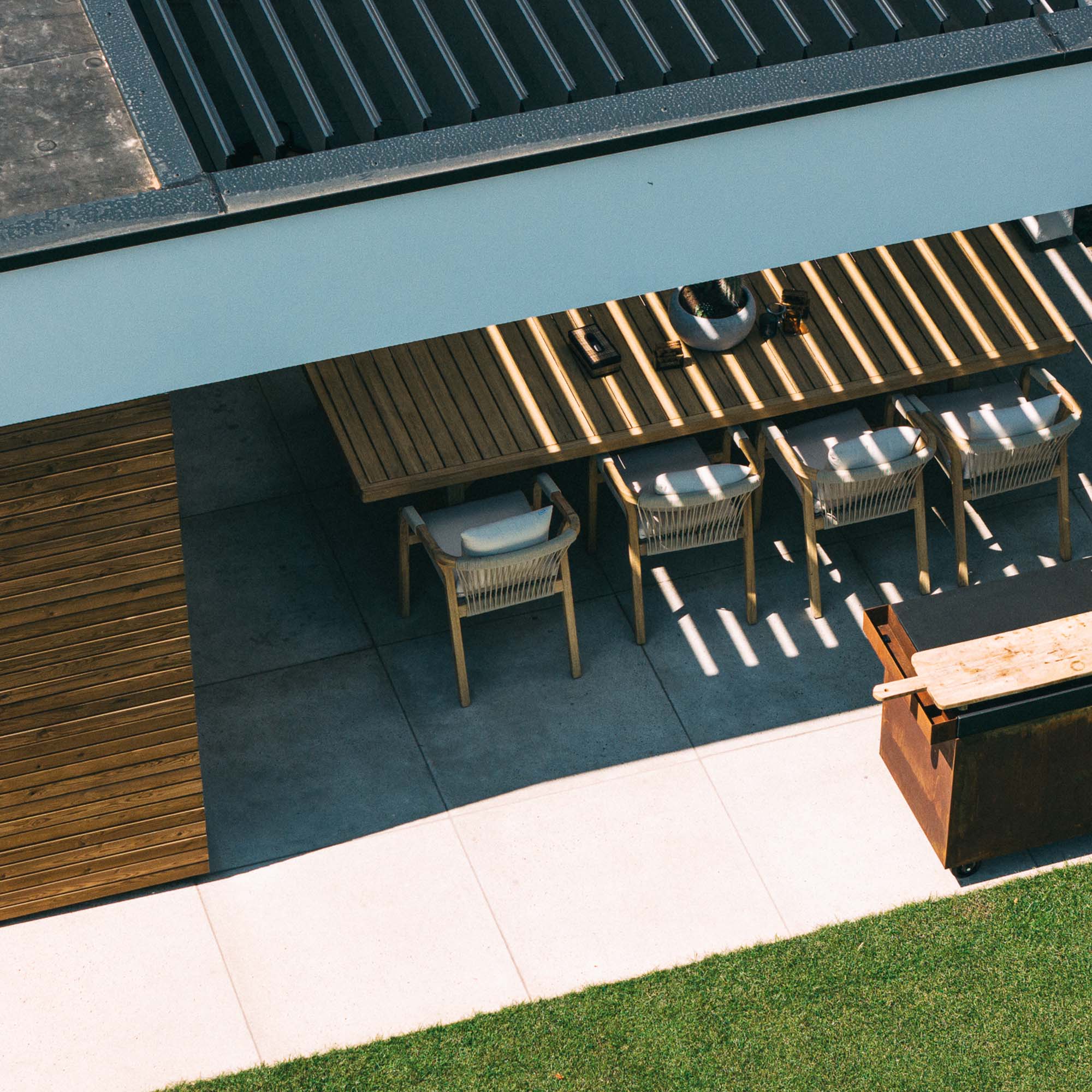De schuur is opnieuw gebouwd, groter dan voorheen, en in het verlengde van de schuur is een overdekte buitenruimte gecreëerd. Boven die buitenruimte is een louvredak geplaatst, dat opengezet kan worden om de zon binnen te laten en automatisch sluit bij regen. De zwevende haard zorgt ervoor dat het ook lekker toeven is als de temperatuur wat zakt. De combinatie van materialen, het stukwerk, waxed wood en de donkere accenten van het dak, maken het een stijlvol geheel. Een aanwinst voor de leefruimte van deze opdrachtgevers.