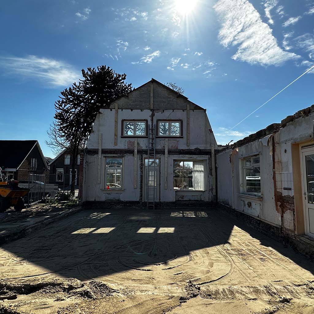 Wij houden wel van een goede uitdaging, zoals deze transformatie. De vergunning eiste behoud van de gevel. Niet onterecht, het is een mooi, karakteristiek aanzicht. Deze is dus blijven staan en gesteund toen de rest van de verouderde woning gesloopt werd. Achter de gevel is een stalen spantconstructie aangebracht, en twee enorme puien. Je kan dit helemaal afwerken, maar de keuze om de constructie een hoofdrol te geven en daarmee het pand een industrieel karakter, heeft ontzettend goed uitgepakt. Op de nieuwe betonvloer zijn klinkers aangebracht om buiten nog meer naar binnen te halen.