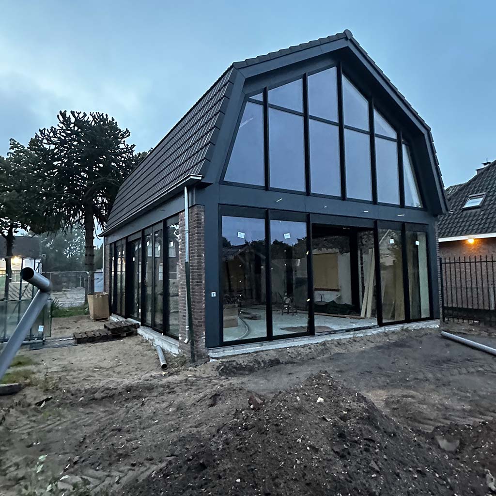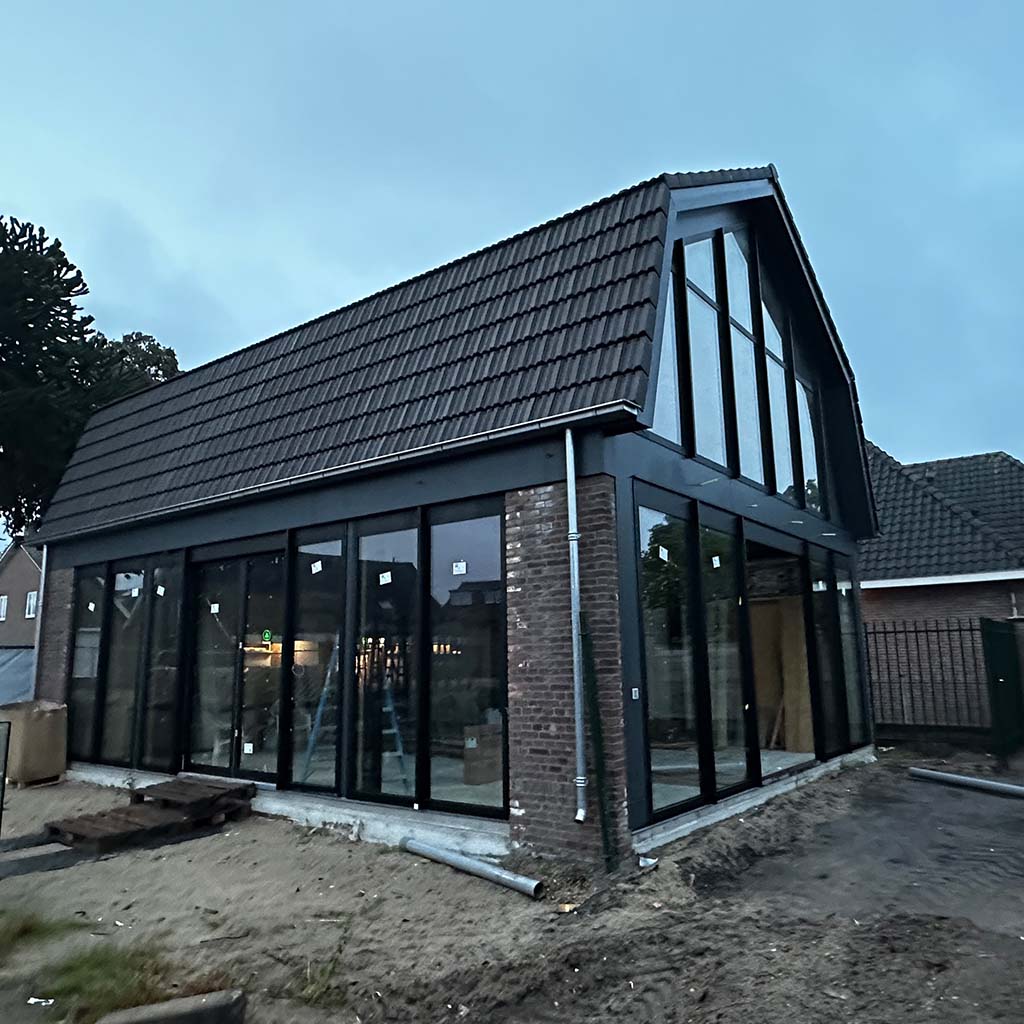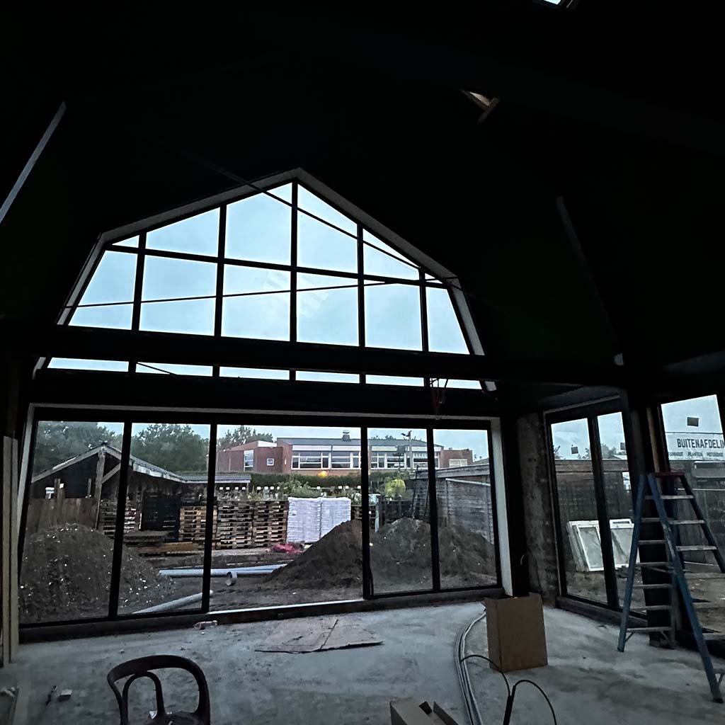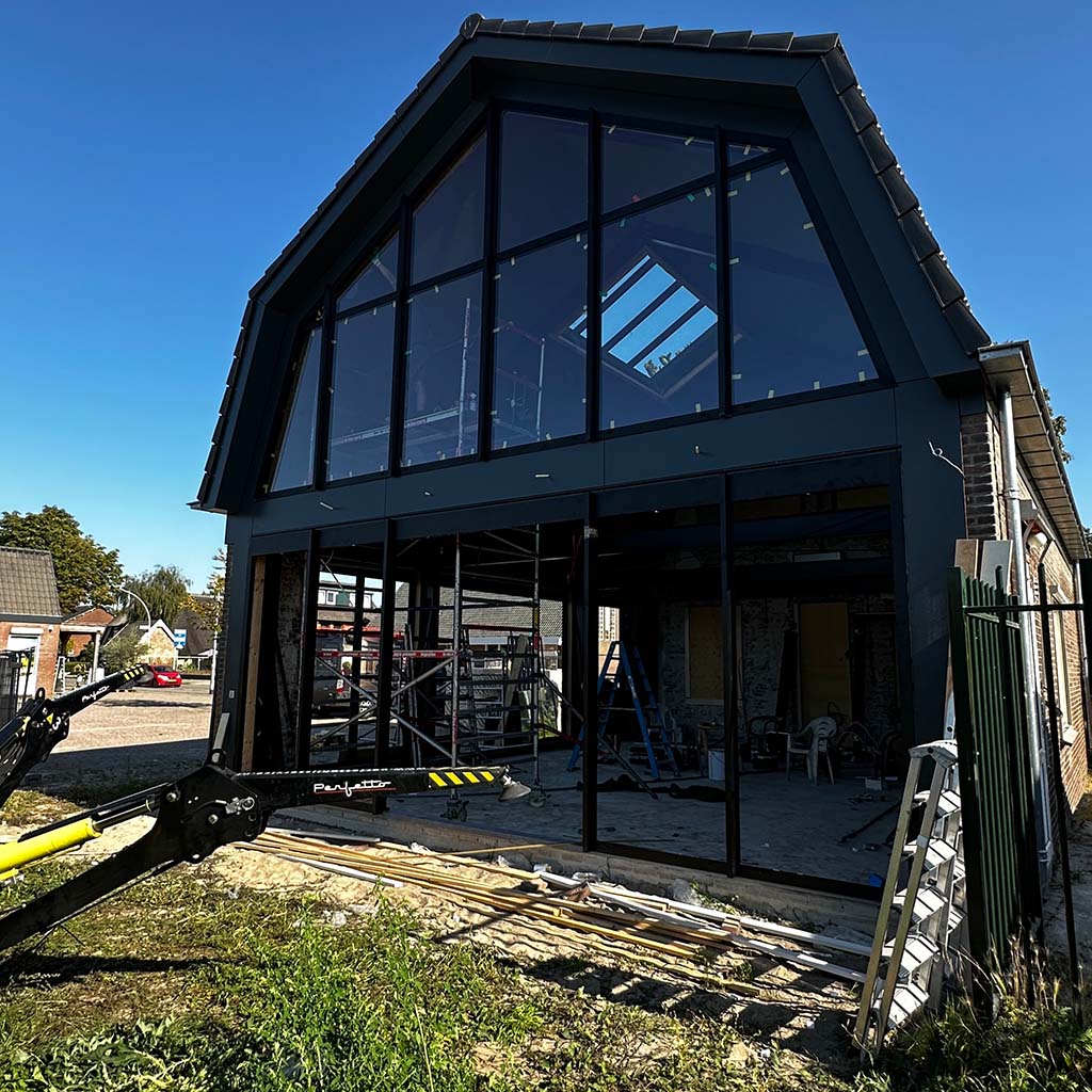 Wij houden wel van een goede uitdaging, zoals deze transformatie. De vergunning eiste behoud van de gevel. Niet onterecht, het is een mooi, karakteristiek aanzicht. Deze is dus blijven staan en gesteund toen de rest van de verouderde woning gesloopt werd. Achter de gevel is een stalen spantconstructie aangebracht, en twee enorme puien. Je kan dit helemaal afwerken, maar de keuze om de constructie een hoofdrol te geven en daarmee het pand een industrieel karakter, heeft ontzettend goed uitgepakt. Op de nieuwe betonvloer zijn klinkers aangebracht om buiten nog meer naar binnen te halen.