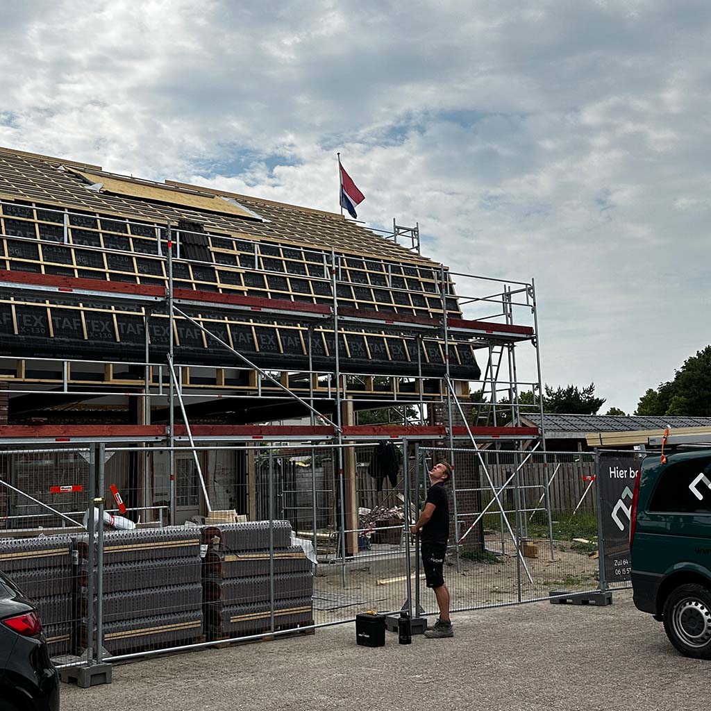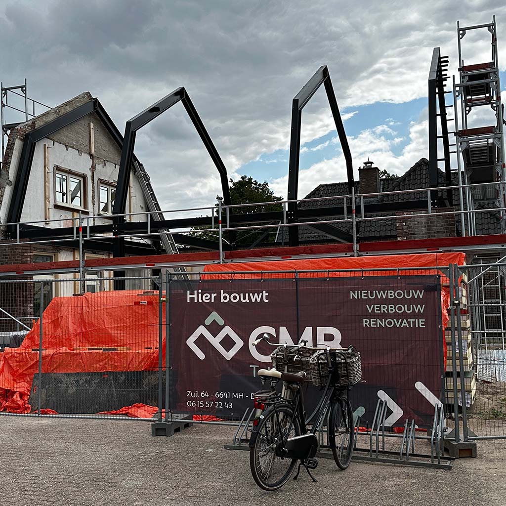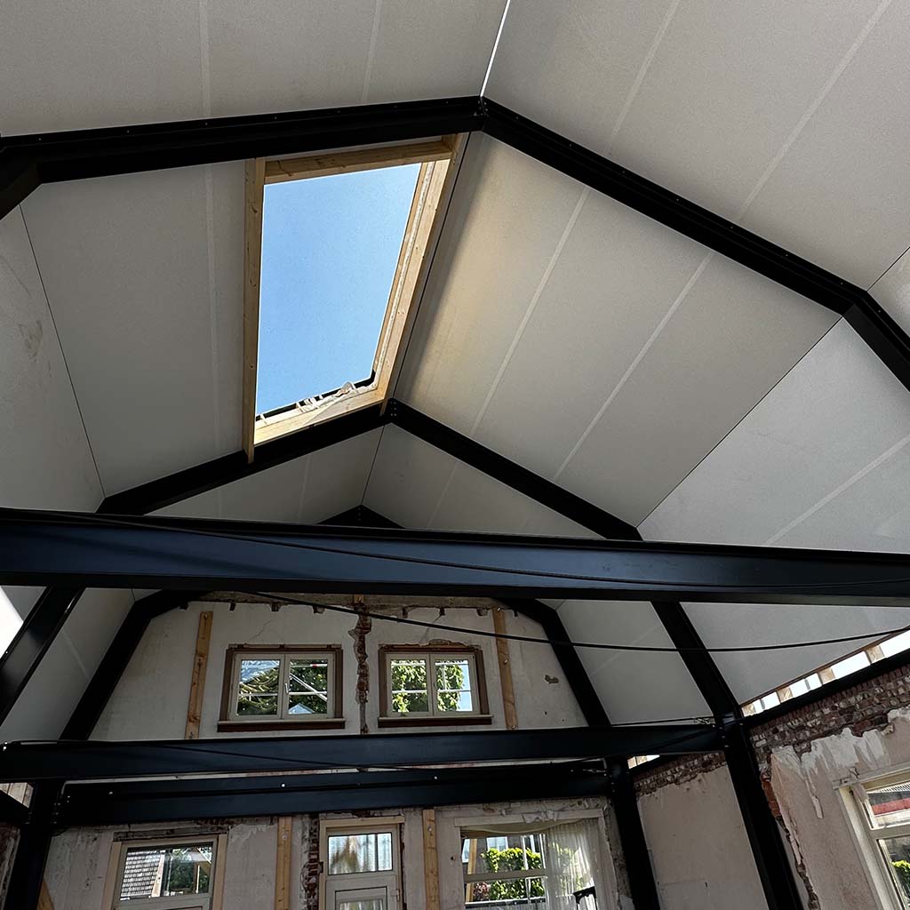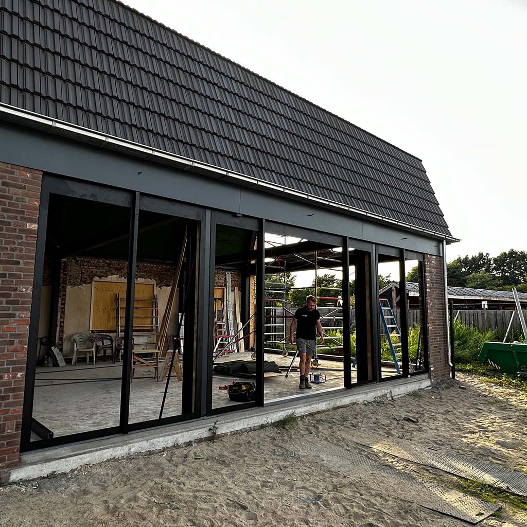 Wij houden wel van een goede uitdaging, zoals deze transformatie. De vergunning eiste behoud van de gevel. Niet onterecht, het is een mooi, karakteristiek aanzicht. Deze is dus blijven staan en gesteund toen de rest van de verouderde woning gesloopt werd. Achter de gevel is een stalen spantconstructie aangebracht, en twee enorme puien. Je kan dit helemaal afwerken, maar de keuze om de constructie een hoofdrol te geven en daarmee het pand een industrieel karakter, heeft ontzettend goed uitgepakt. Op de nieuwe betonvloer zijn klinkers aangebracht om buiten nog meer naar binnen te halen.